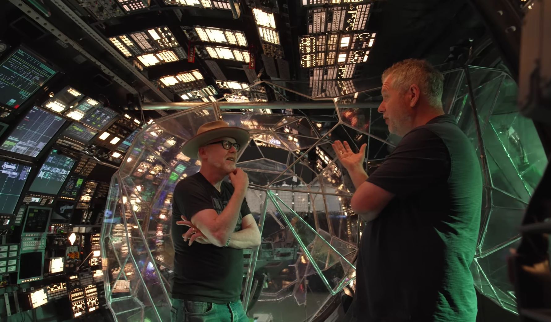 Adam Savage listening to Project Hail Mary Production Designer Charlie Wood inside the cockpit practical set.